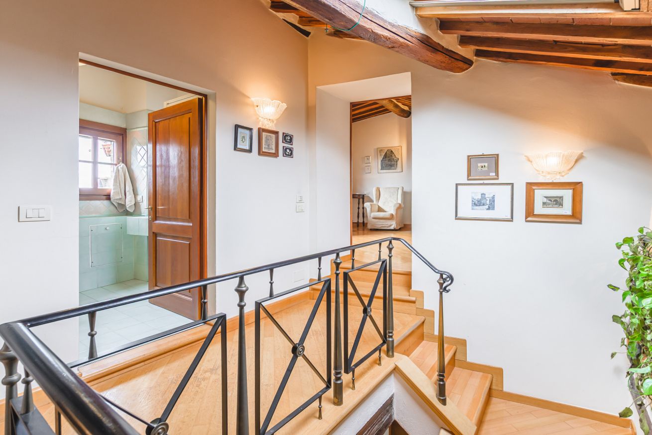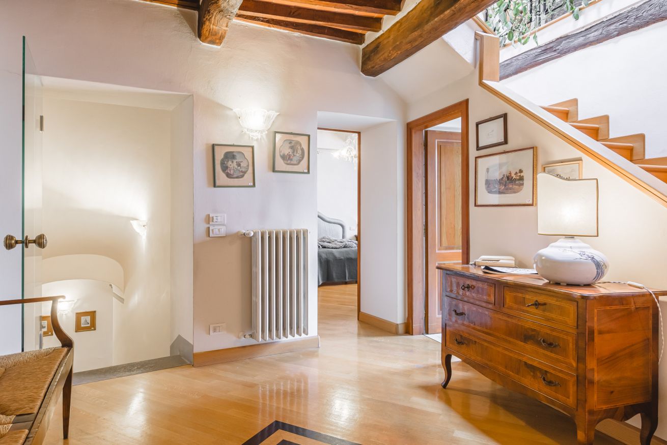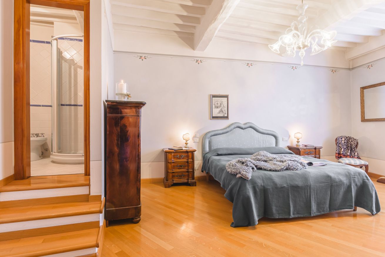 • Al secondo piano la zona notte ospita due splendide camere matrimoniali: una dotata di bagno doccia ensuite e l'altra servita da un raffinato bagno con vasca, perfetto per un momento di relax totale.