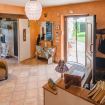 - Un soggiorno luminoso e spazioso con ampie vetrate, vista sulla campagna e camino in pietra.